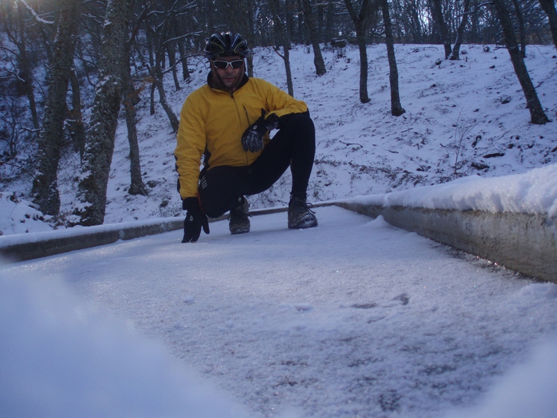 Sigo subiendo, aprovecho la rodada de un coche, fuera de ella soy incapaz de mantenerme en la bici. Llego al pilón, y leñe está congelado (He dicho que hace un frío del carajo?).